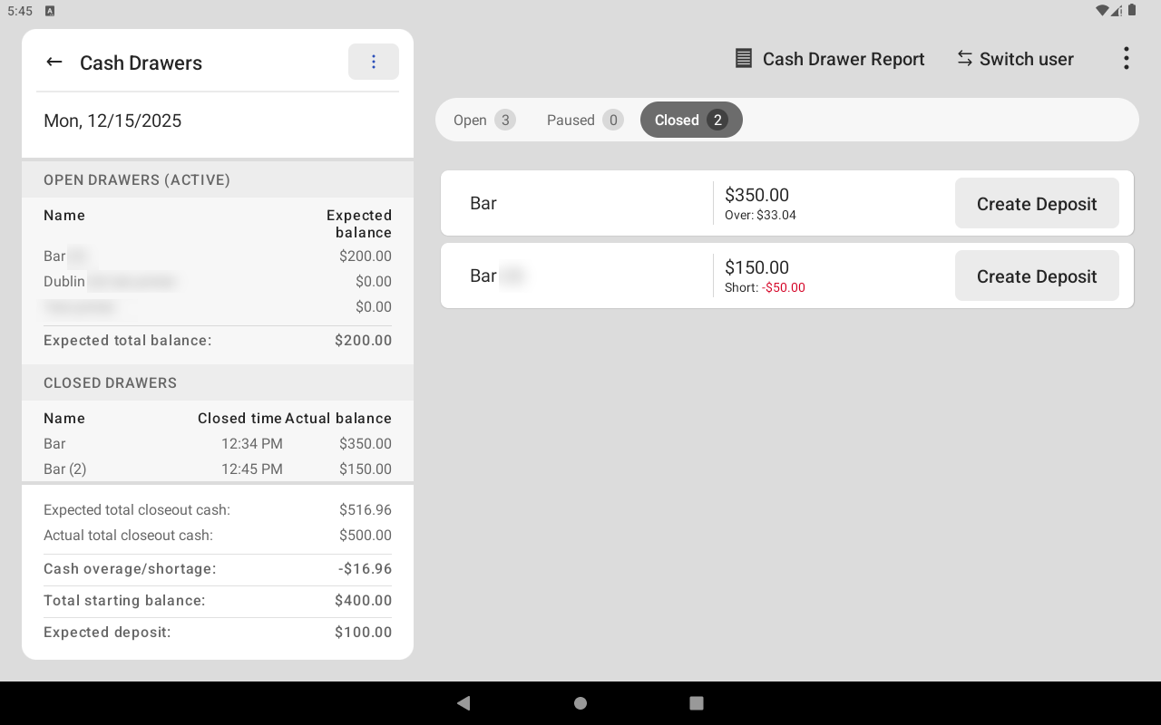 Easily view cash overages or shortages: Closed drawers now display the actual cash counted and the overage or shortage amount.