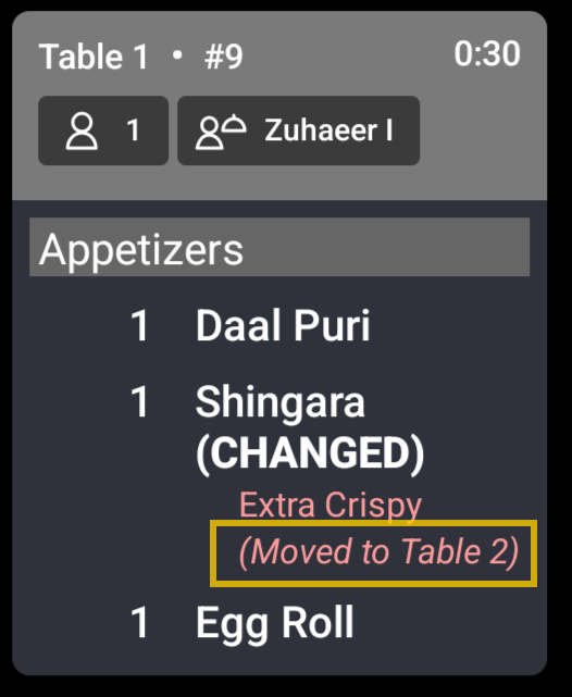 Previously, if an item is moved from one table to a different table, the kitchen ticket used CHANGED to indicate this change. Now on the new KDS (grid view), additional text, similar to modifiers, appears below the item to indicate the table where it was moved to.